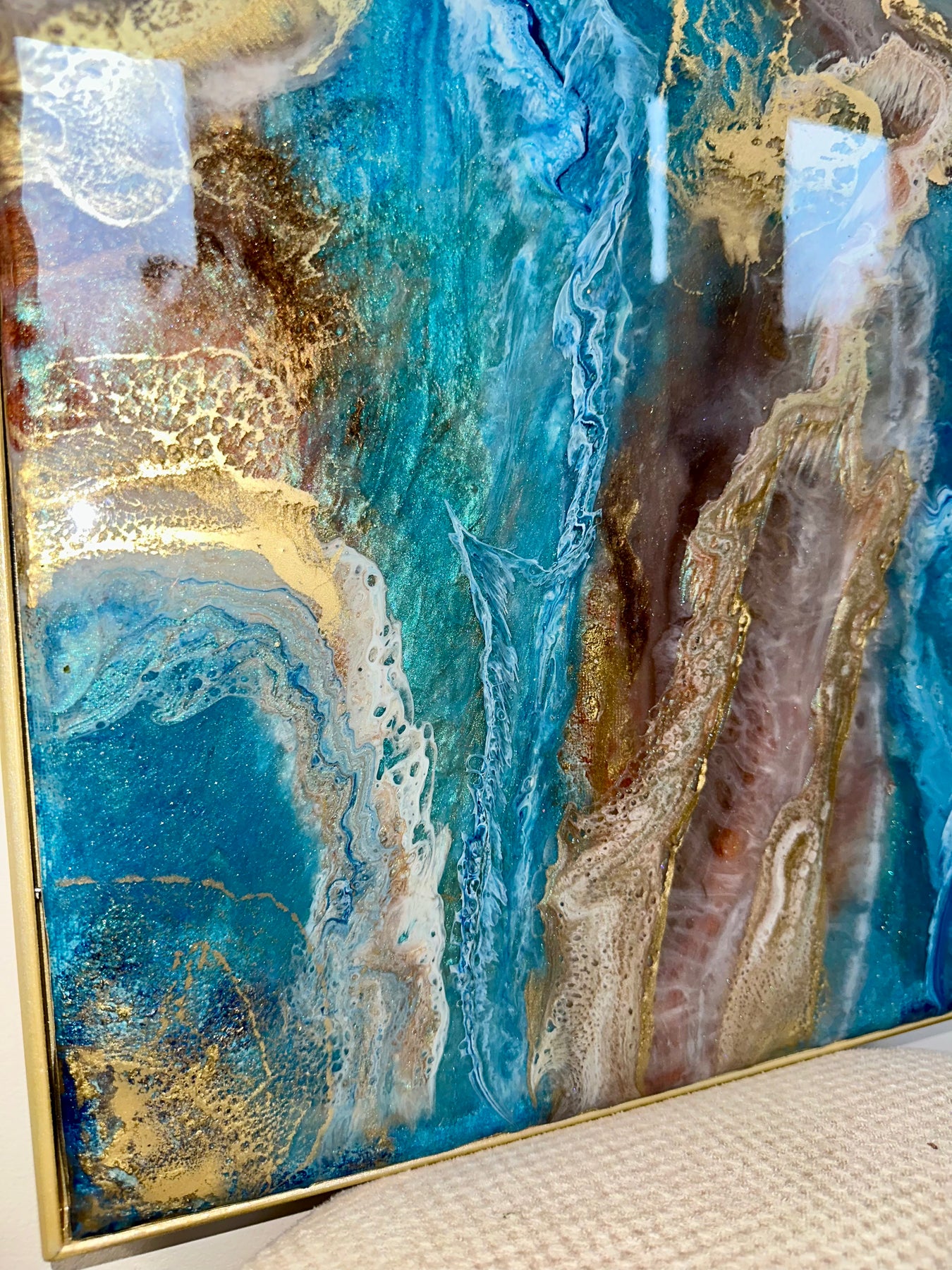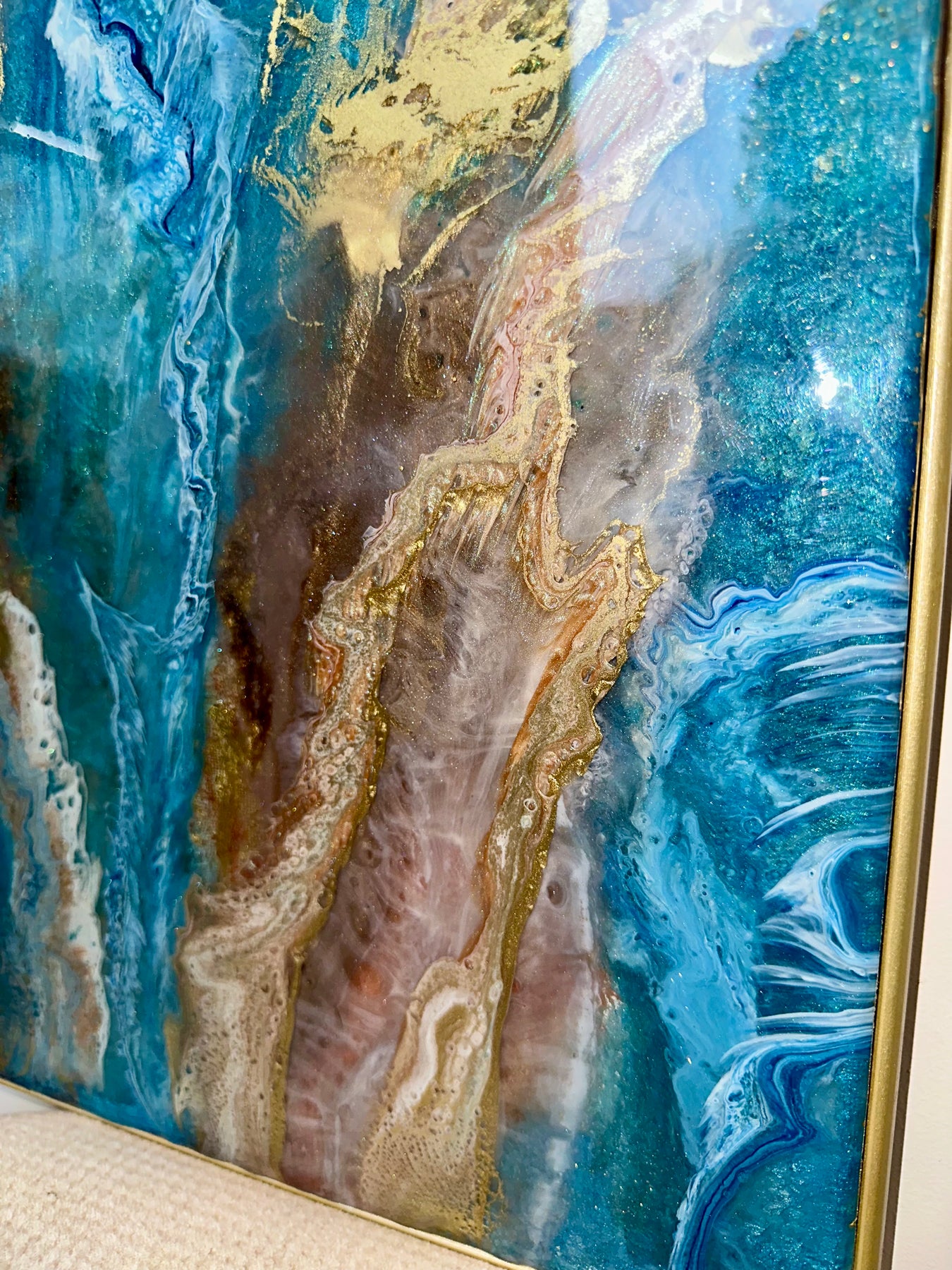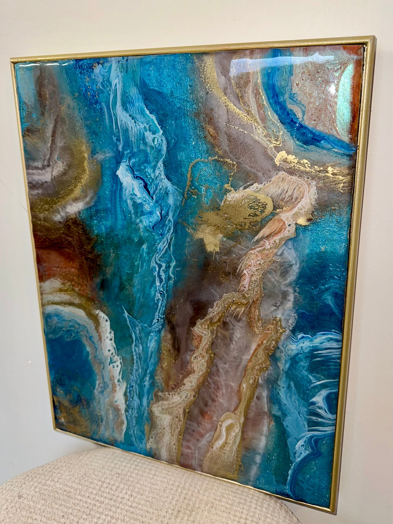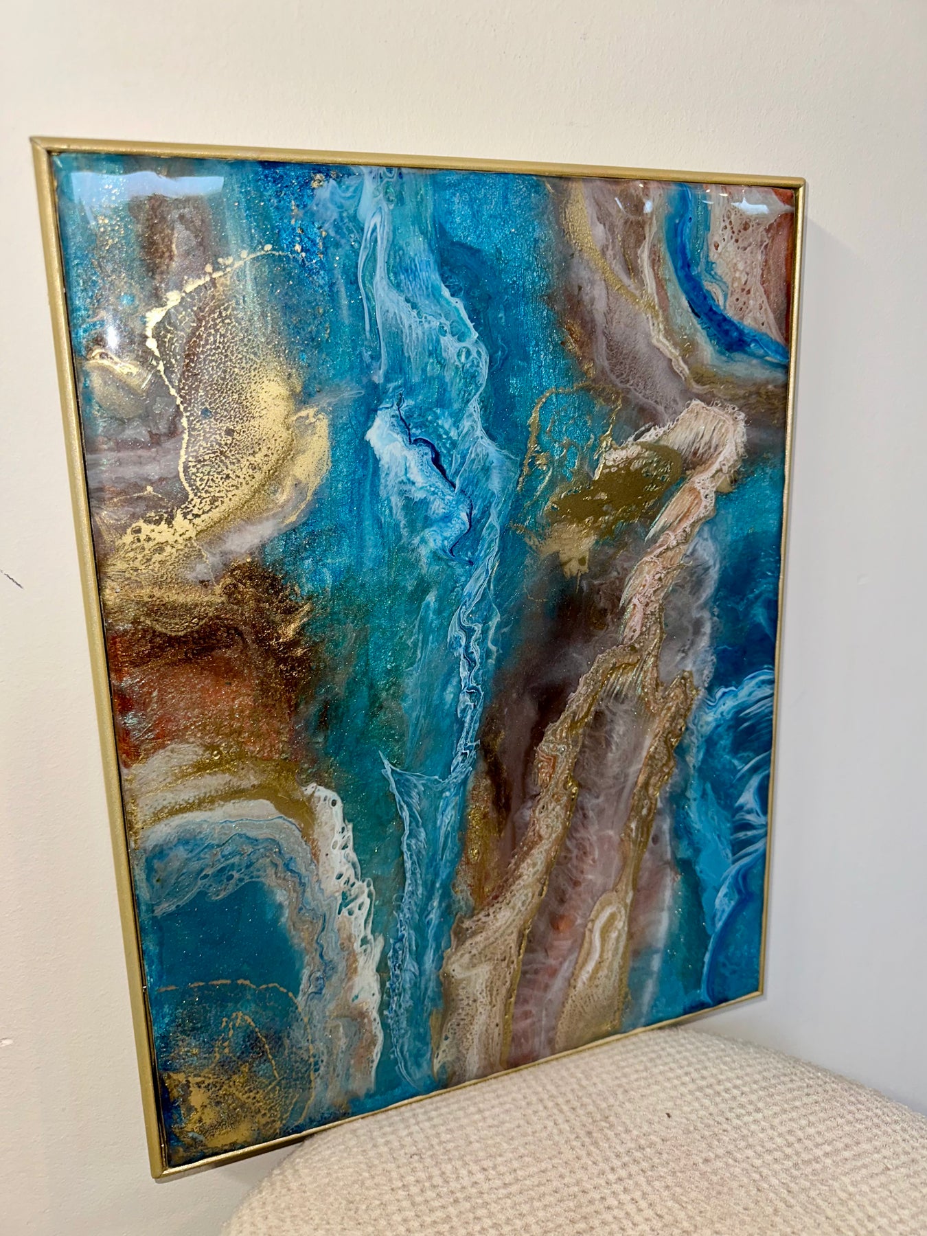 Each layer has been hand-poured to create depth, movement, and texture — resulting in a luxury statement piece designed to elevate any interior. Finished in a brushed gold frame, this artwork arrives ready to hang.