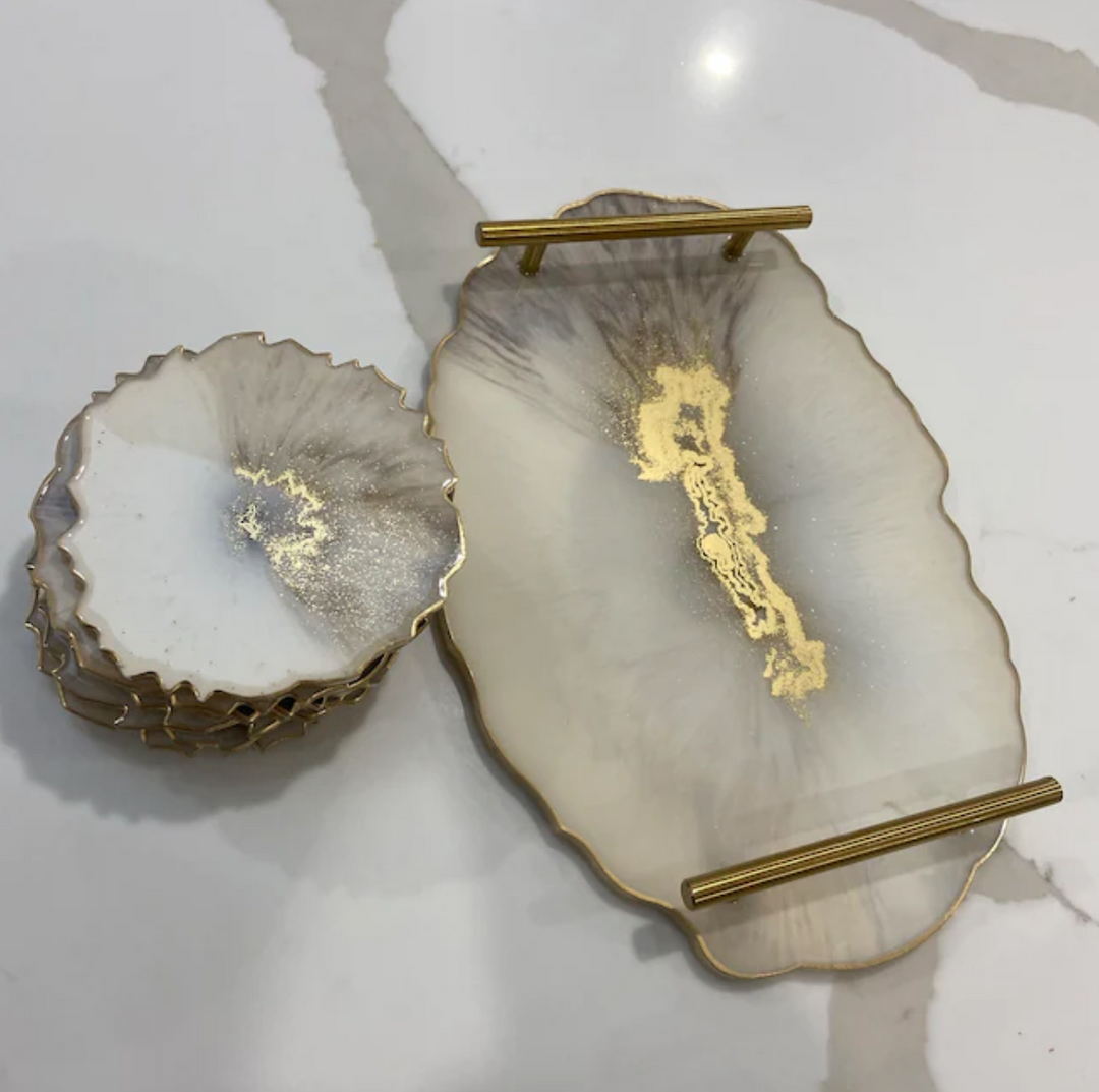 "In love with my coasters and tray! Amazing customer service and I was even able to change the handles to suit my preference which I loved! And I was given cute little gifts with my order, Will definitely be shopping here again"